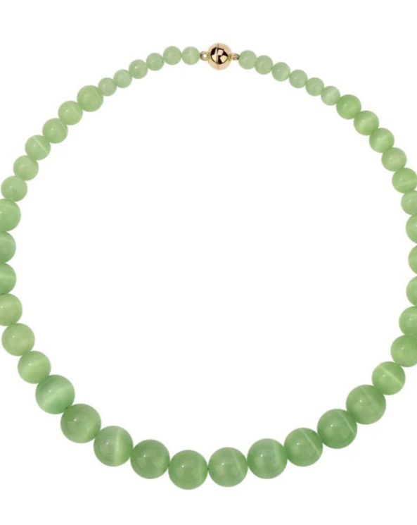 The captivating green cat's eye stones reflect a mesmerizing chatoyance, reminiscent of the tranquil beauty of a summer lake. Each bead's dynamic luster and vibrant hue make this necklace a perfect accessory for those who seek to capture the energy and passion of the season.