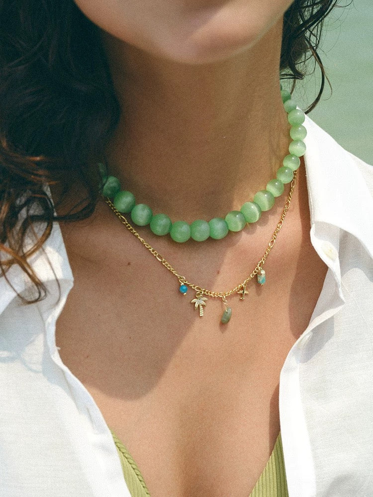 Dive into the enchanting beauty of summer with our Summer Vibes Lake Green Cat's Eye Necklace and let its vibrant charm elevate your style.